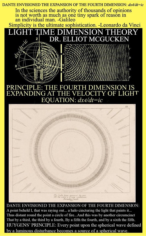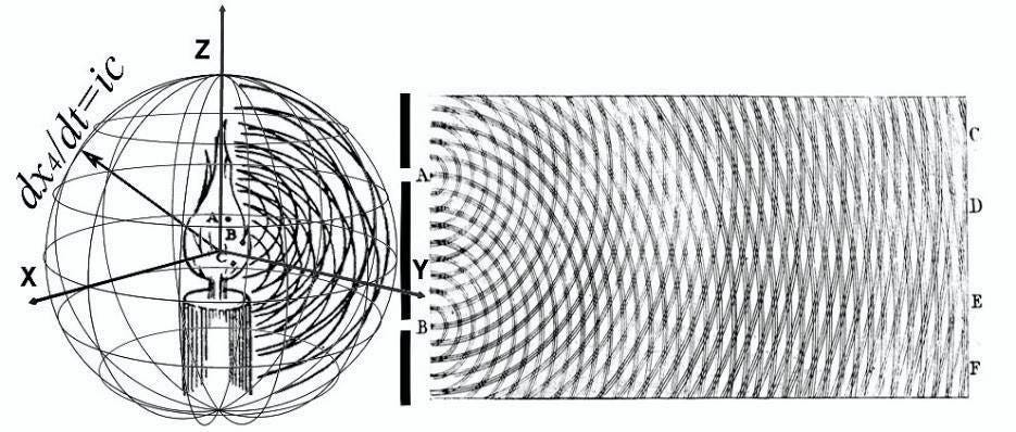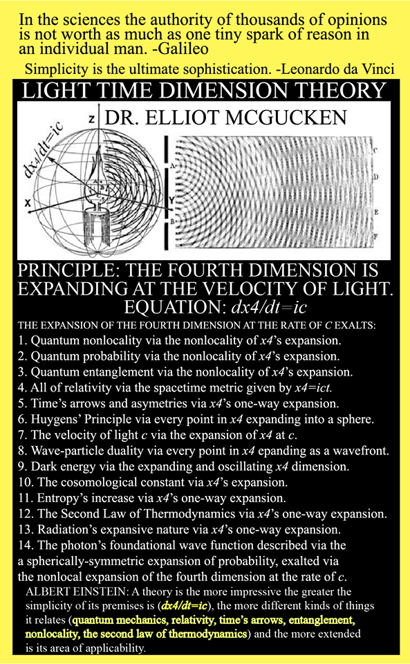 As illustrated in the sphere centered upon Huygens’ candle above, the fourth dimension expands at the rate of c, carrying photons while fathering time and all its arrows and asymmetries, relativity, and quantum nonlocality, entanglement, and probability — all unified via dx4/dt=ic.