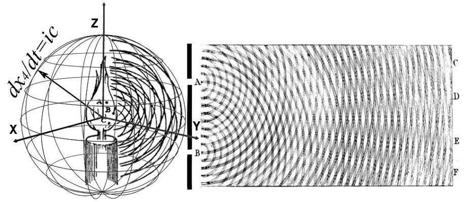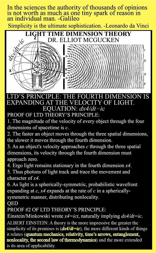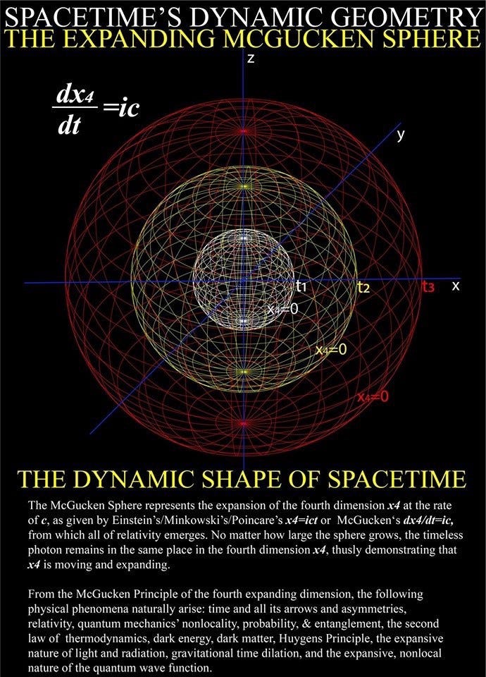 As the photon sees no space nor time between any two points, these points are at the same place to the photon. So it is that within a light sphere, or a McGucken Sphere, there always exists a frame where there is no time nor distance between any two events. Thus, that which is considered “the past,” in any quantum eraser or double slit experiment which takes place within a McGucken Sphere, may easily be considered the present. And that which is considered to be a great distance may be considered to be no distance at all. And so it is that relativity gives us nonlocality, as both relativity and quantum nonlocality rest upon the deeper foundations of a fourth expanding dimension given by dx4/dt=ic. Time and all its arrows an asymmetries are also seen to emerge from this most foundational principle, as is the Second Law of Thermodynamics and Huygens’ Principle which stipulates that ever point on a photon’s wavefront is a sphere expanding at the rate of c, again, as given by dx4/dt=ic
