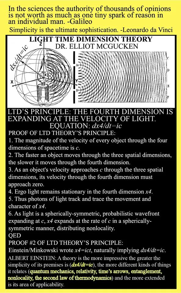Albert Einstein: A theory is the more impressive the greater is the simplicity of its premises (dx4/dt=ic), the more different are the kinds of things it relates (relativity, the quantum, time, dark matter, dark energy, entanglement) and the more extended the range of its applicability.